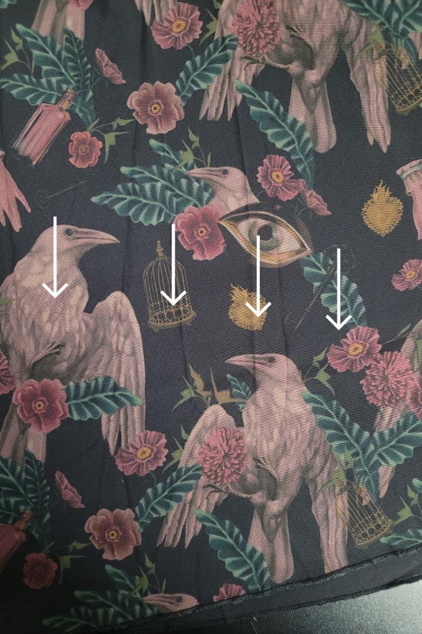 Знижку -35% вказано через виявлений дефект з принтом сукні у розмірі L фото №2,3: при принтуванні потрапила нитка, через що і виникла біла незапринтована частина; та затяжку позаду внизу у розміра М, фото №4,5