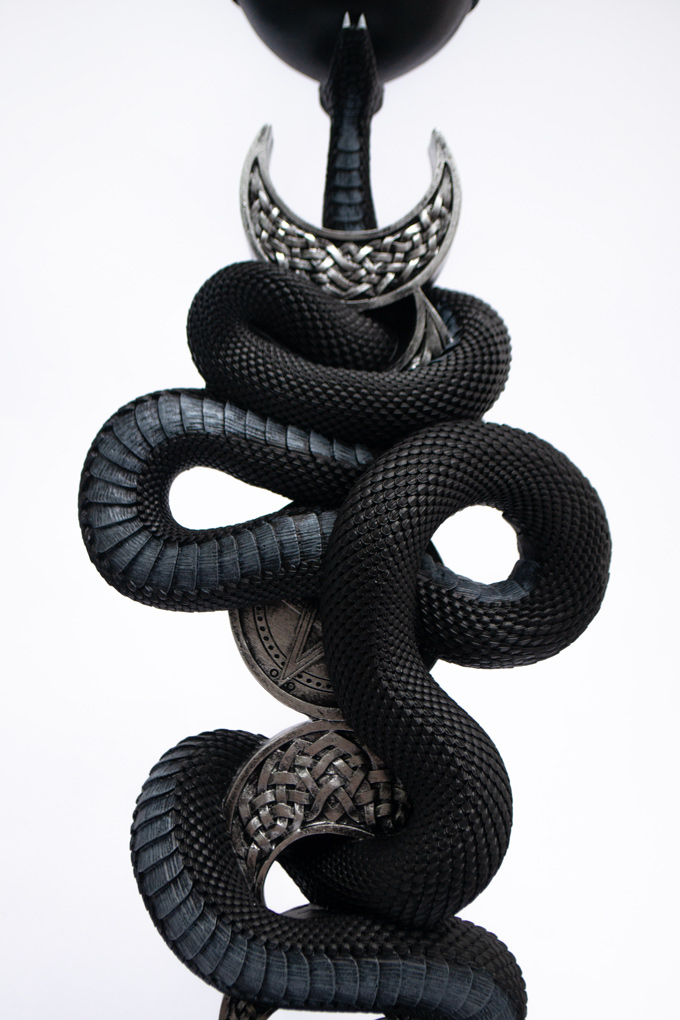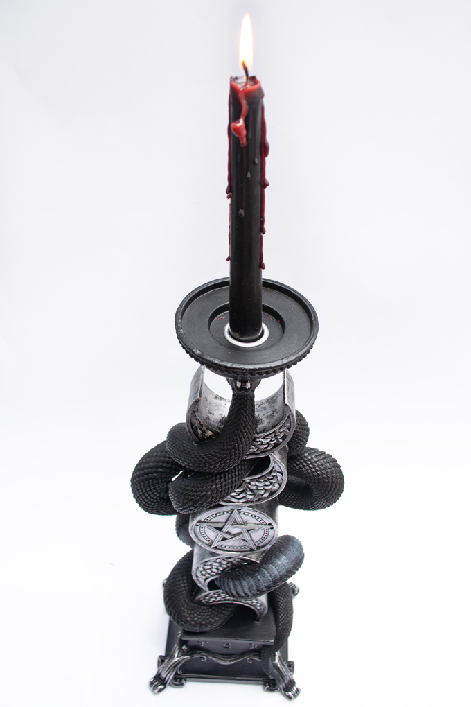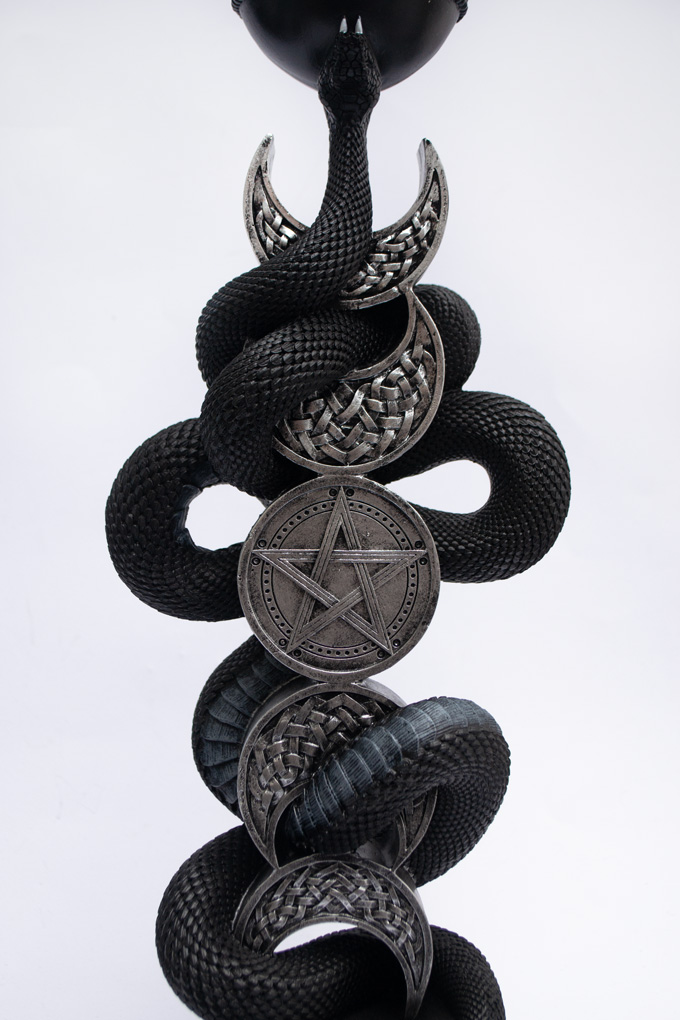 Фази місяця обвиває могутня чорна змія, з найзвичайною деталізацією луски, яка розкритою пащею тримає чашу зі свічкою, але так ніколи і не зможе її проковтнути