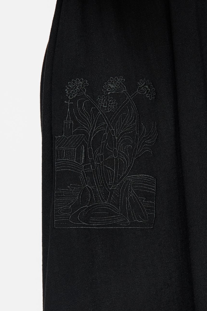 Чорна вишивка, натхненна гравюрою на дереві, розкидана по всій сукні